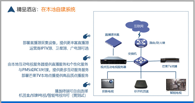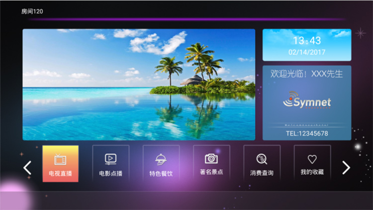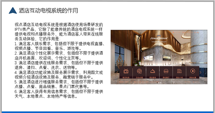 “智慧酒店”互动电视是本公司运作的针对高端星级酒店的一个解决方案。目前主要和各大电视机厂家合作,为酒店深度定制智能互动电视系统,该系统包括电视机及互动电视系统2部分。目前主要合作的电视机厂家有:飞利浦、海信、创维、长虹、TCL、海尔、看尚、扬子、夏新等电视机品牌。且对个品牌的电视机均作了深度的对接和适配,确保为酒店带来更好的用户体验。基于互联网+云服务及三大运营商IPTV业务,在结合运营商IPTV架设影视汇聚服务器,终端智能电视机内嵌服务器UI2.0。为酒店定制化个性需求,满足酒店风格化、尊贵化的体验。通过该系统,有效提升酒店的管理、效率、为酒店节省前期投资成本和后期运营成本。以比较亲民的价格空间、为酒店营造个性化、尊贵化的无限价值。