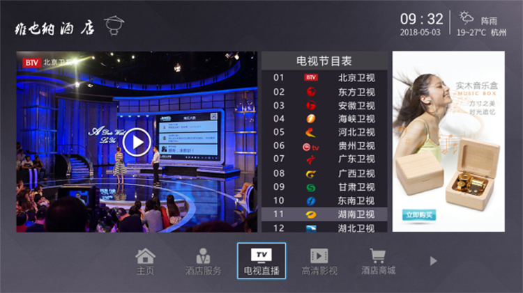 高清节目实时更新、自主选择“电视收看”功能,将酒店客房内原有的有线电视及WX电视信号同时接入系统,可供客人自主选择喜欢的节目。数字电视目前可采用卫星、本地有线、运营商IPTV的信号源作为直播信号源。