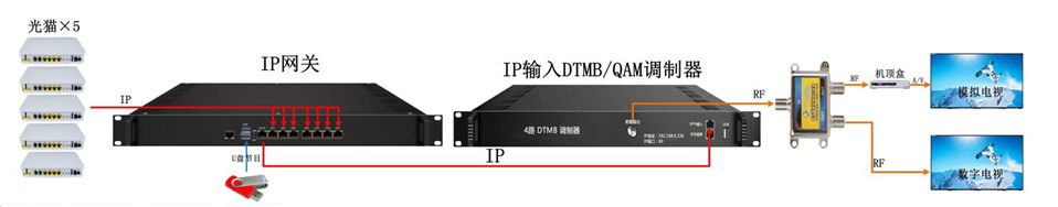 IP网关可接收电信、移动、联通等运营商的直播信号,将接收到的信号通过IP输出至DTMB/QAM调制器,调制后经过同轴电缆把信号传输至接收终端(如机顶盒/智能电视)。