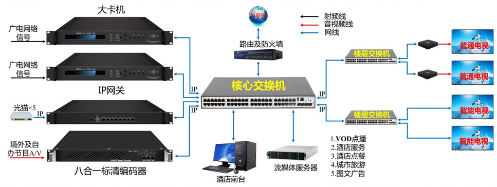 本系统信源采用大卡机、编码器、IP网关可接收电信、移动、联通等运营商的直播信号,将接收到的信号通过IP网络输出至核心交换机,通过核心交换机和楼层交换机将信号传输至IPTV机顶盒和智能电视机。智能电视机安装APK软件实现节目播出。