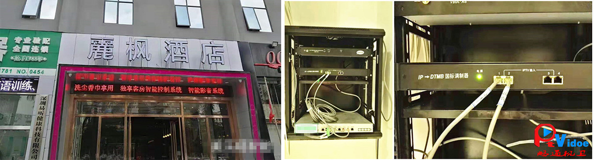 本公司为丽枫酒店时代城店承接,设计,施工,安装一站式服务,方案设计为酒店原有的光纤百兆宽带,只用了宽带运营商2个IPTV光猫共采集46套标清IPTV电视节目,接入IP-DTMB国标数字调制器走闭路有线电视线路传输到80个房间,整个电视前端机房核心设备只需要三台就可以完成,不占用机房空间,安装方便简捷
