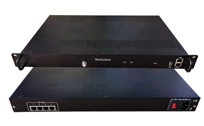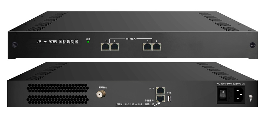 4网口IP DTMB调制器是我公司专为营业性场所解决数字电视信号源而*研发的具备高性能、高性价比的IP转 DTMB国标调制器。该设备前面板由4个百兆网口组成,4个网口均为IPTV输入;后面板由1个射频口、2个IP口和一个USB接口组成,射频口支持3/4个DTMB单载波输出,2个网口分别为1路百兆/千兆自适应IPTV输出和网管口(主要作用选择节目)。该设备具有高性能、低成本的特点,非常适合各种营业性场所(如:酒店、会所、茶楼等)数字电视前端系统使用。
