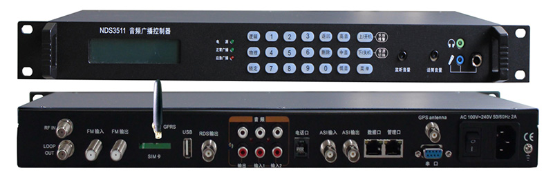 NDS3511音频广播控制器是一款集成度高,用于数字应急广播平台的专业广播控制设备;该设备支持1路RF射频输入及环出、1路FM调频信号输入、1路千兆IP输入、2组RCA音频信号输入、1路ASI输入、1路USB插入、1路话筒和电话信号(有线无线)输入;支持1路ASI输出、1组RCA音频输出、支持4路千兆IP输出、1路FM调频输出,支持RDS输出,支持本地监听功能和专业管理接口,支持串口接入及GPS输入。该设备具有高度集成性,可接收上级下传信号并向下一级广播,可向下一级发送控制指令,也可通过电话、短信或话筒等多种形式实现实时应急广播,还可播放DVD、USB等设备输出的音频广播节目,可广泛用于数字应急广播系统中。